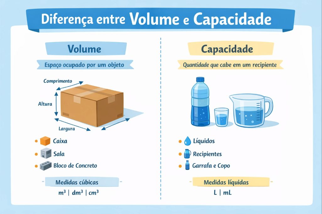 Em outras palavras, o volume está relacionado ao tamanho de um corpo tridimensional, e a capacidade está relacionada ao quanto um recipiente pode armazenar, geralmente líquidos. Entenda melhor essa diferença no infográfico abaixo: