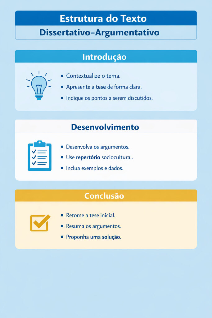 Produzir um texto dissertativo-argumentativo exige organização de ideias e planejamento antes da escrita. Para alcançar o objetivo, convém seguir um processo estruturado e, com isso, desenvolver argumentos coerentes. Veja como funciona a partir da seguinte estrutura: